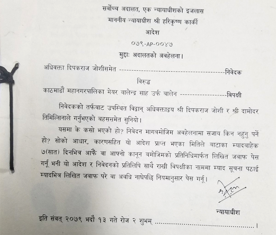 सोमबार न्यायाधीश हरिकृष्ण कार्कीले उक्त निवेदनमाथि सुनुवाइ गर्दै ७ दिनभित्र आफैं उपस्थित भएर जवाफ दिन आदेश दिएको हो ।